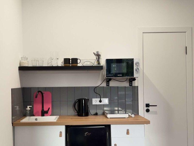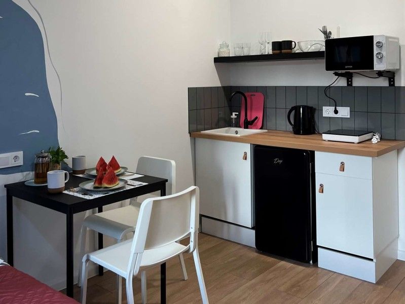 Номерной фонд включает несколько уютных двухместных студий с фирменной росписью на стенах. Каждая полностью укомплектована для отдыха с комфортом: в наличии удобная двуспальная кровать, функциональная кухонная зона, собственный санузел. Во всех апартаментах работает Wi-Fi. Заселение с питомцем возможно по предварительному согласованию.
